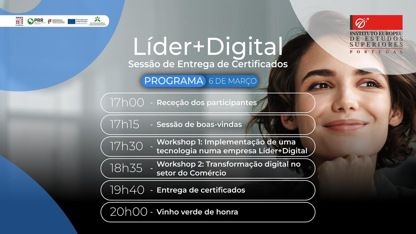No próximo dia 6 de março, realizar-se-á, no Auditório do Instituto Europeu de Estudos Superiores de Fafe (IEES), a Sessão de Entrega de Certificados aos participantes do Projeto Líder +Digital.